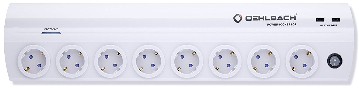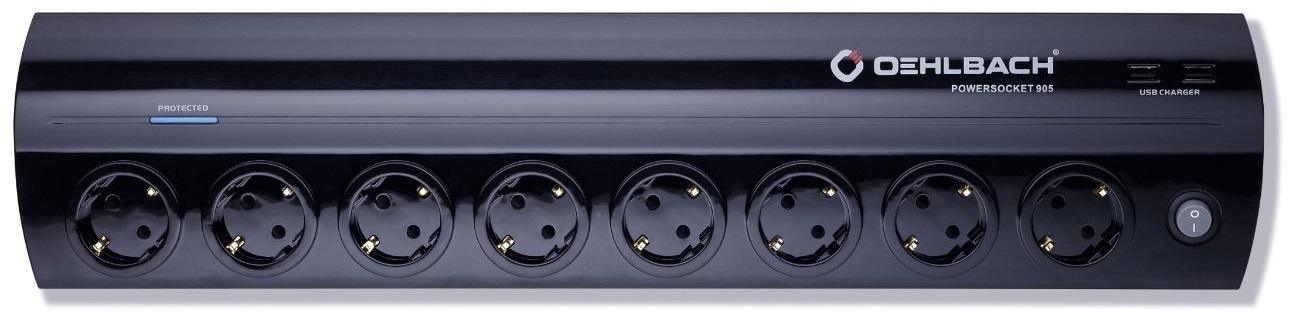 Oehlbach Powersocket 905 имеет 8 стандартных электро розеток и два USB-разъема. Включение розеток питания и USB-разъёмов осуществляется с помощью общего сетевого выключателя.