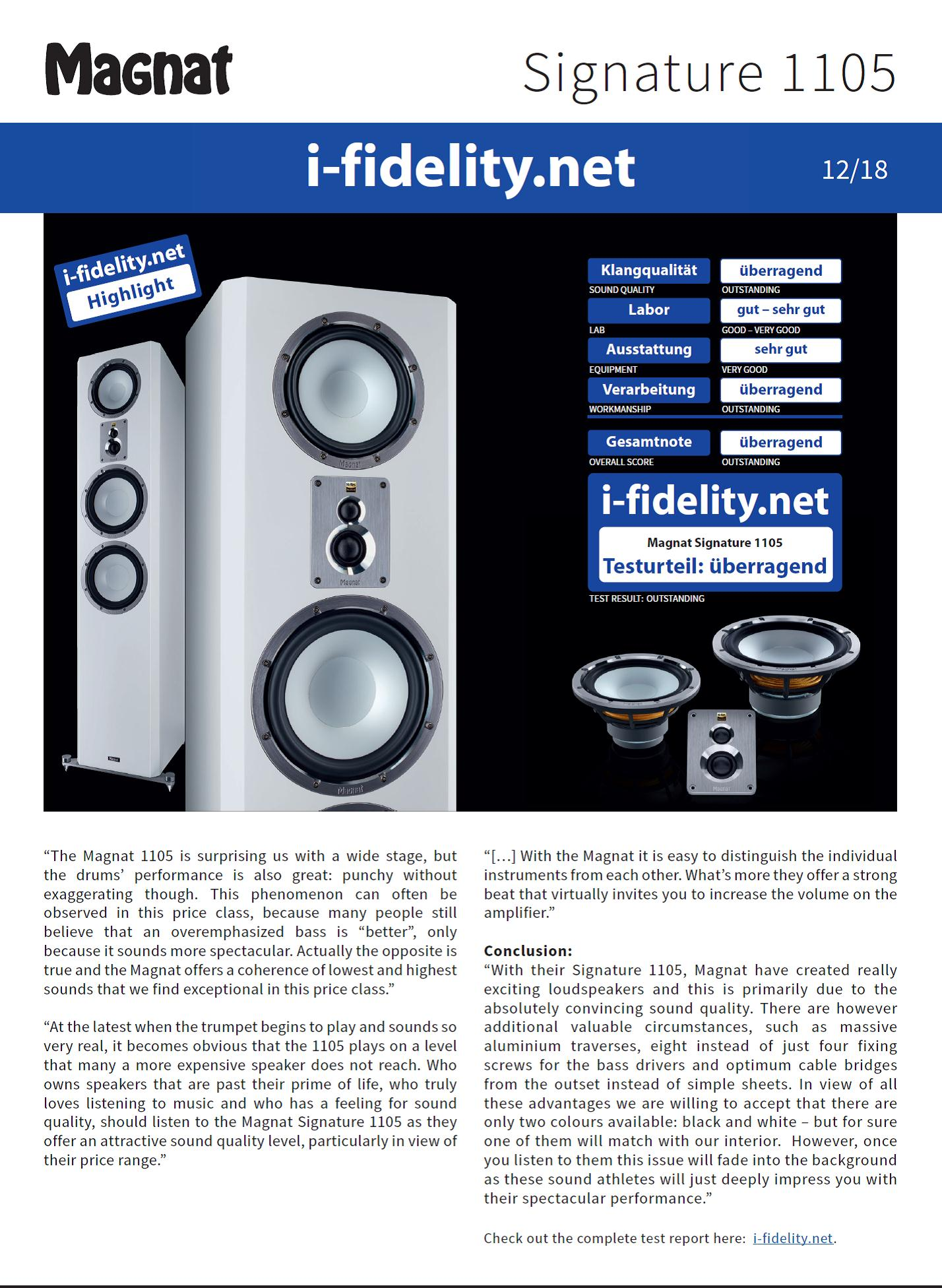 «Magnat Signature 1105 здивує вас відчуттям широкої сцени, але якість витворення ударних також є чудовою, витворення чітке, але не надмірне. Це характерно для висококласних дорогих виробів. Багато людей до сих пір вважають, що виразний бас «краще», тільки тому що це звучить більш ефектно. Насправді все якраз навпаки, але в цьому випадку Magnat Signature 1105 пропонує збалансовані звуки низьких і високих частот, що як раз і є винятком в цьому ціновому класі ».